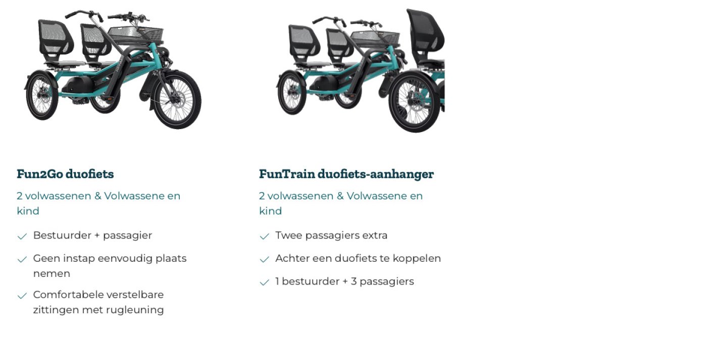 De duofiets is een bijzondere vorm van tandem waarbij je naast elkaar zit in plaats van achter elkaar. Dit zorgt niet alleen voor meer overzicht en gezelligheid, maar ook voor een veilige en stabiele rit. De bestuurder houdt de controle, terwijl de passagier zelf kan meetrappen. Met uitbreidingen zoals de FunTrain kan zelfs met meerdere personen tegelijk worden gefietst. De duofiets maakt samen bewegen eenvoudig, leuk en toegankelijk voor allerlei situaties.