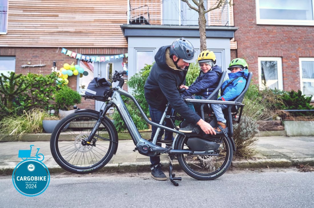 “Een relatief nieuw cargo concept dat steeds meer navolging krijgt. Onderscheidend qua uiterlijk, maar rijdt als iedere andere ‘normale’ e-bike qua comfort en wendbaarheid: je rijdt er zo op weg! De inzetbaarheid is breed en daarmee is dit concept voor iedereen geschikt, zowel kinderen als cargo neem je eenvoudig aan boord. Het smalle profiel maakt hem eenvoudiger te stallen. Lekker compleet uitgerust met fietstassen en met mooie details zoals de stevige standaard met bediening op het stuur”.