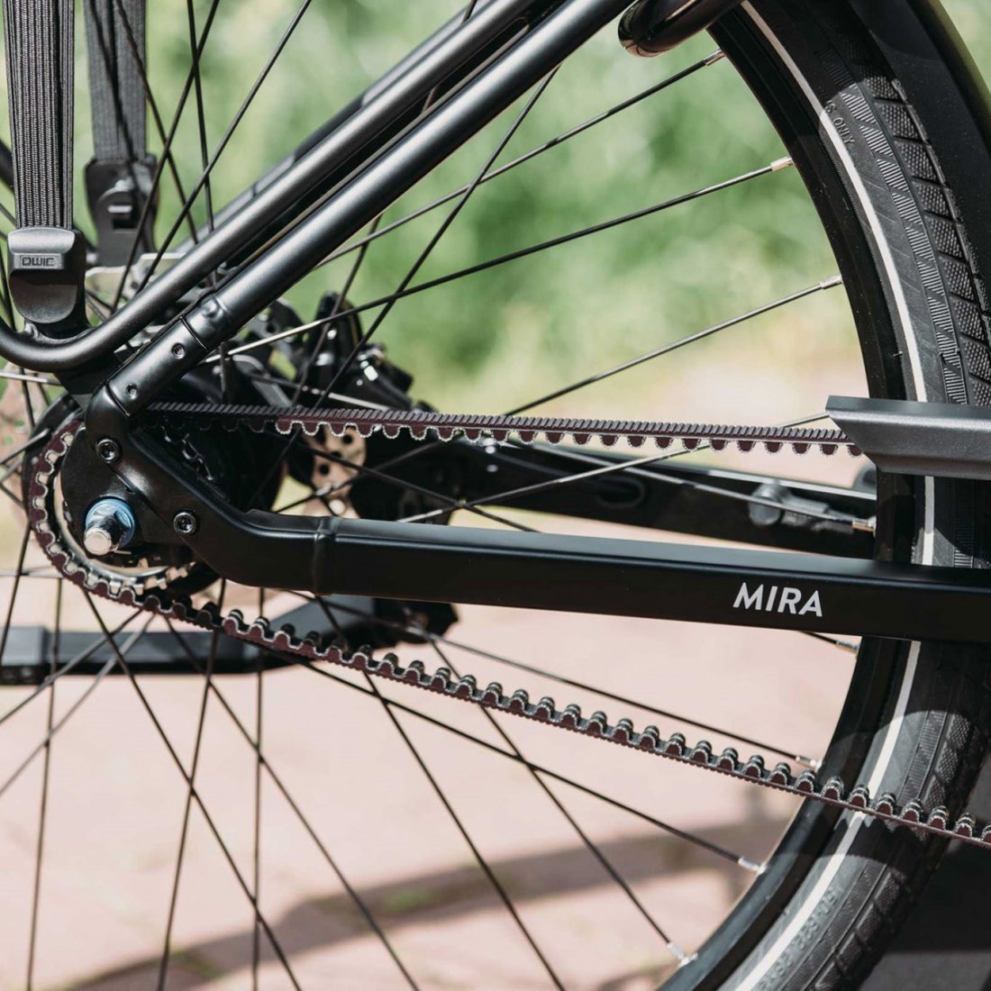 De Mira Tour is met een Riemaandrijving van carbon en krasvrij kunststof uitgerust. Daardoor is dit model bijzonder duurzaam, onderhoudsarm, soepel en stil.