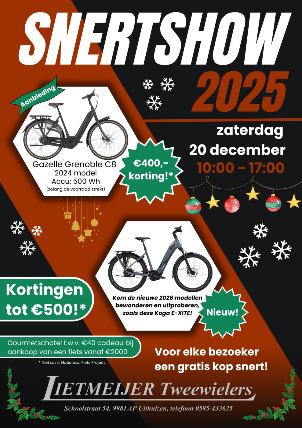 De snertshow is de ultieme kans om een fiets of aanverwante accessoires aan te schaffen tegen een scherpe prijs. Uiteraard staan dit jaar ook al weer modellen voor 2026 in de winkel, maar de modellen waar we niet mee door gaan worden voor snertprijzen verkocht. Zet de datum alvast in je agenda en ga ons volgen op Facebook of Instagram.